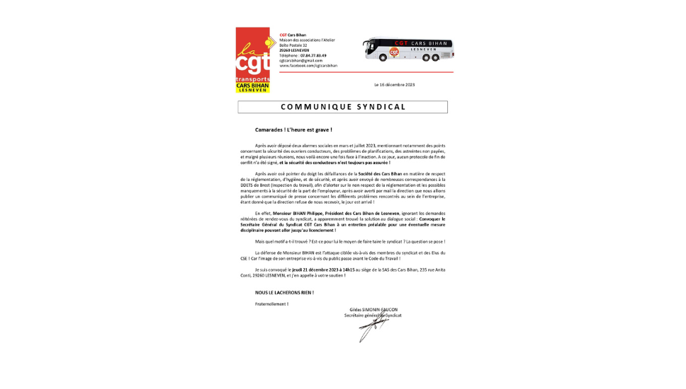 L’UD CGT 29 appelle toutes nos forces capables de répondre, à soutenir notre camarade, jeudi 21 décembre à  partir de 13H30 devant le siège des cars Le Bihan à Lesneven.