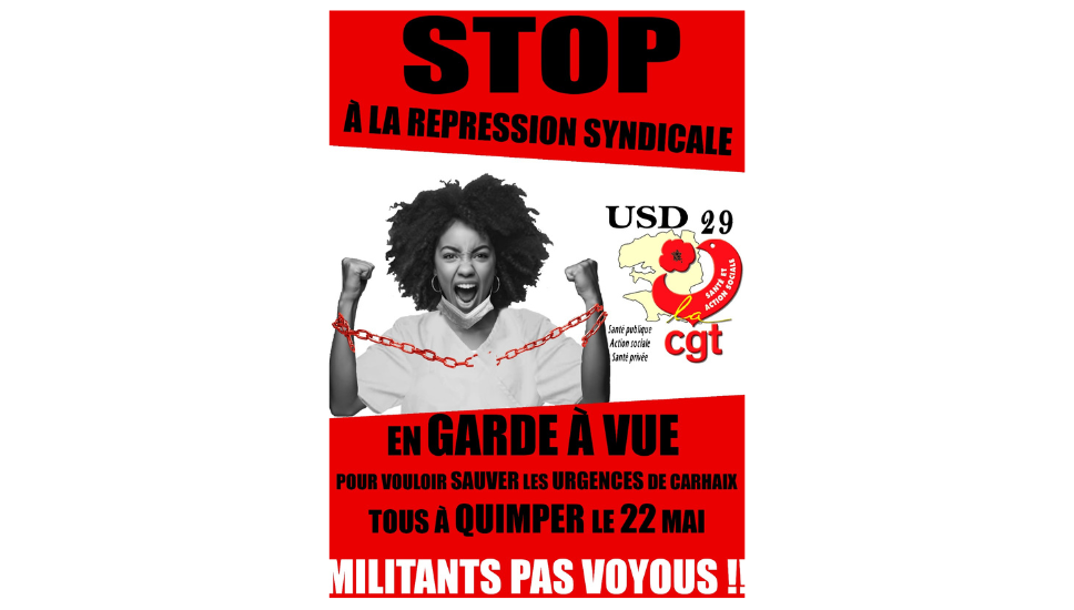 INSUPPORTABLE pour l’Union Départementale CGT qui appelle tous les syndicats et leurs adhérents à soutenir nos camarades à Quimper. Pour les modalités pratiques vous trouverez en téléchargement le tract d'appel de la CGT du CHU Brest-Carhaix (avec le QR code pour vous inscrire pour le car) + Affiche CHU.
