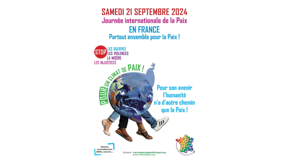 le Collectif national des marches pour la paix appelait partout en France, dans le plus grand nombre de communes et dans la plus grande unité possible, à organiser des actions les 20, 21 et 22 septembre 2024 (marches, rassemblements, concerts, etc.) pour faire de la journée internationale de la Paix 2024 un grand moment de rassemblement pour la paix.