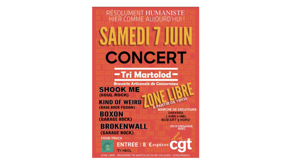 Dans un contexte où les inégalités se creusent et où les solidarités sont mises à rude épreuve, il est essentiel de défendre ensemble nos valeurs d’humanisme, de justice et de fraternité. C’est dans cet esprit que L'Union Locale de Concarneau et la section syndicale CGT EVIOSYS Métaux Finistère Sud organisent une soirée-concert , ouverte à toutes et tous, dans une ambiance festive, conviviale et engagée contre les idées fascistes.