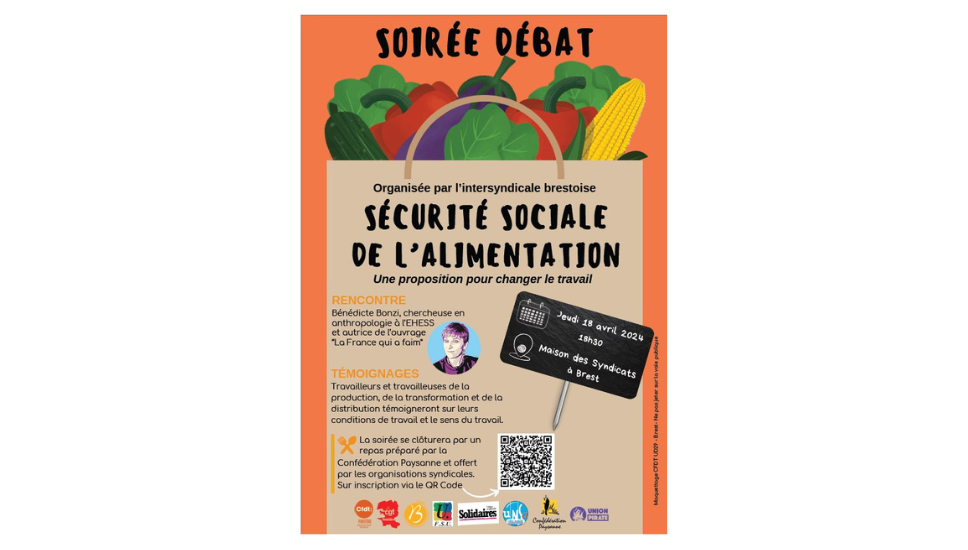 L'intersyndicale brestoise et la Confédération Paysanne  vous invitent à une soirée débat : " Sécurité sociale de l'alimentation, une proposition pour changer le travail " le 18 avril, à 18h30 salle des Syndicats.