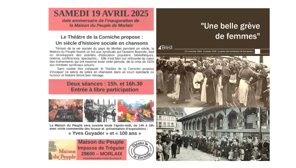 Au cours de deux séances d’un court spectacle (15 h et 16 h 30), le Théâtre de la Corniche évoquera en chansons, parfois avec humour, ce siècle d’histoire sociale morlaisienne (entrée libre à participation)."