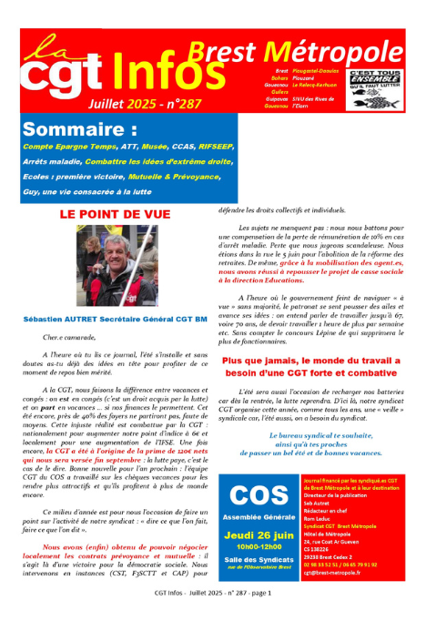 Vie Syndicale CGT Infos Brest Métropole N°287 Publié le 27 Jun. 2025 Numéro 287 Nombre de pages 8 Auteur CGT Brest Metropole Télécharger Partager l'article: Télécharger l'article Imprimer l'article