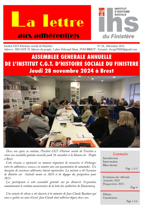 Numéro spécial assemblée générale annuelle de l'Institut CGT d'histoire sociale du Finistère qui s'est réunie le 28 novembre à la maison du Peuple à Brest.