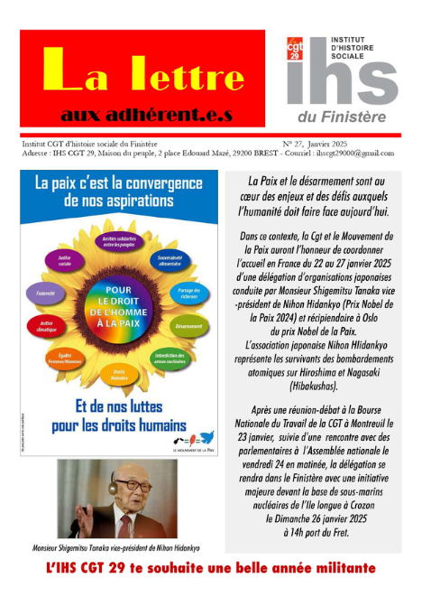 Histoire La lettre aux adhérent(e)s N°27 Publié le 03 Jan. 2025 Numéro 27 Nombre de pages 4 Auteur IHS 29 Télécharger Partager l'article: Télécharger l'article Imprimer l'article
